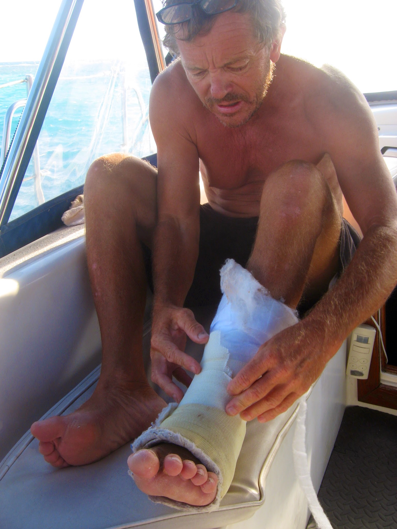 After some difficulties getting an x-ray which a specialist was able to read, I finally got treated by an Irish-Grenadian orthopedic surgeon - complete with brogue, picture of the Pope, and a rosary with green beads! He studied the x-rays and did not recommend surgery - phew! The diagnosis was a broken calcaneus (heel bone), and the treatment was a cast for seven weeks. This process took three days in Grenada. Now, to get back to my boat on Union Island - luckily for me, my girlfriend Marie was keeping a good eye on her for me! The planes (puddle jumpers) are all full for the next week, but twice a week a "mail boat" runs from Carriacou to Union Island, and the next trip is only one day away. So, first I take the Osprey (a proper ferry which runs every day) from Grenada to Carriacou, then clear out of the country in Carriacou and wait for the 'mail boat'. And wait, and wait...Is it normal for the crew to spend an hour and a half in the bilge with wrenches before leaving the dock? This is a small, old boat, with a plywood "wheelhouse". It only travels at about five knots, but it stops completely when one of the crew gets a fish on their hand line! But, eventually, we arrive in Union, Marie is there to meet me (and feed me), and I get back to my boat. So, four days after leaving, I am home, sweet home!